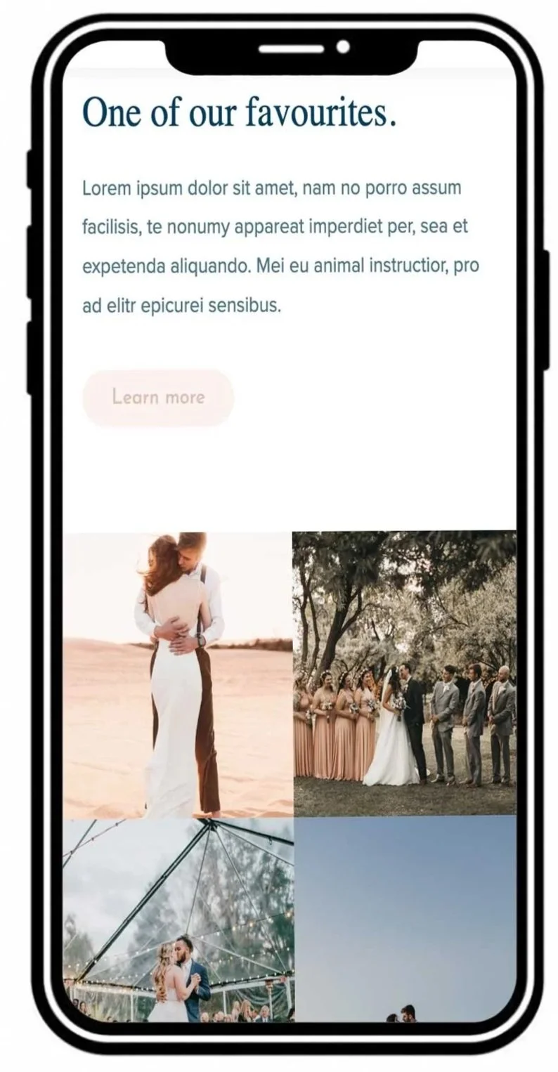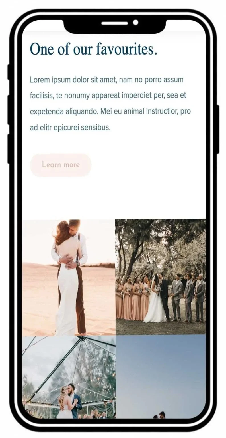 The 3rd of our lovely wedding themed website designs. The full width sections with overlay text would suit a wedding supplier, a couple, or a celebration website.