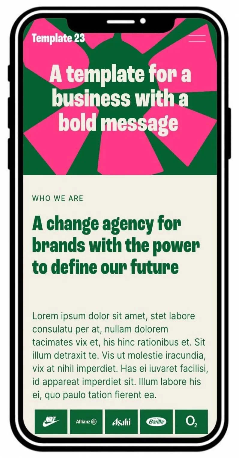 Bold layout. This layout would compliment a brand. If you have a strong message, a set of colours and logos you might want a punchy layout that you can customise.
